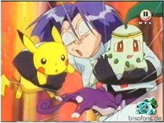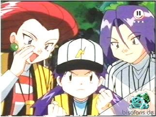 Bevor es weitergeht, mischt Team Rocket mit und setzt ferngesteuerte Apparaturen gegen Ash und Cathy ein. Damit hat Team Rocket sogar Erfolg und es gelingt ihnen Endivie und Pikachu zu schnappen. Nachdem Ash Cathy etwas Mut zuredet, kämpfen die beiden Trainer gemeinsam gegen Team Rocket. Bisasam, Schiggy, Rattfratz und Taubsi heizen Team rocket so stark ein, dass diese die gestohlenen Pokémon wieder freigeben müssen und verschwinden.