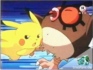 Ash schickt als nächstes sein Pikachu in den Kampf, welches als ElektroPokémon ja eigentlich im Vorteil gegenüber FlugPokémon ist. Pikachu kann Hoothoots Attacken geschickt mit Agilität ausweichen und setzt eine eigene Blitzattacke oben drauf. Der abschließende Ruckzuckhieb macht Hoothoot schließlich kampfunfähig und zwingt Falk dazu sein zweites Pokémon in den Kampf zu schicken. Dabei handelt es sich – etwas überraschend – um Dodri.