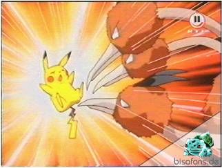 Ash fragt Pikachu ob es weitermachen will, und es sagt ja. Doch Pikachu kann nicht einmal seinen Donnerblitz erfolgreich einsetzen, was Tauboss für eine Wirbelwind-Attacke nutzt, die Pikachu kampfunfähig macht.