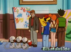 Jack Pollackson macht sich unterdessen Vorwürfe, daß er wohl kein weiteres Meisterwerk erschaffen kann, da er zu alt dafür geworden ist. In diesem Moment tauchen Jessie und James erneut wieder auf und stehlen die drei Farbeagle. Ash verspricht jedoch diese zurückzuholen. Dies ist auch nicht so schwer, da die Farbeagle eine Spur legten, indem sie Farbtropfen auf den Boden fallen ließen, so daß unsere Freunde sie finden können.