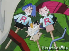 Unsere Freunde kämpfen inzwischen gegen Team Rocket, doch Tevoltra schlägt sich auf die Seite von James. Dort bekommt sie aber die Aquaknarre von Quaputzi ab, so daß sie auf den Boden stürzt. Rocko eilt zu ihr um zu helfen, während Quaputzi, Endivie und Pikachu Team Rocket verjagen.