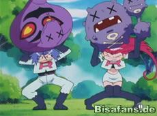 Diese kleine Romanze wird jedoch durch das auftauchende Team Rocket unterbrochen, die versuchen alle Pokémon zu fangen. Doch da holt Ash sein Karnimani aus dem Pokeball. Jessie schickt hingegen Arbok raus, welches jedoch direkt eine Aquaknarre abbekommt. Smogmogs Rauchwolke kann erst durch Quaputzis Blubber beseitigt werden, doch da ist es bereits zu spät – Team Rocket ist weg. Merkwürdig ist jedoch, daß alle Pokémon dageblieben sind und Tevoltra fehlt!
