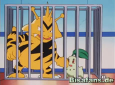 Ash merkt leider, wie wahr dies ist, als er nun auf Elektet trifft. Endivie kann einem Donnerschlag ausweichen. Doch der Rankenhieb scheint nutzlos und wird mit einem Sternenschauer gekontert, bevor Endivie erneut einen Rankenhieb und ein Tackle ansetzt. Doch Elektek ist zu stark und Endivie versucht noch einmal einige Attacken. Mitten im Kampf taucht jedoch plätzlich ein Käfig über den beiden auf, der natürlich von Team Rocket stammt.