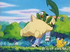 Bevor Team Rocket abhauen kann, gibt es noch einen Abschiedsgruß in Form eines Donnerblitzes und einem Rankenhieb Lorblatts. Doch Team Rocket gibt nicht so schnell auf und setzt erneut die Robo-Rankenhiebattacke ein, die jedoch von Pikachu und Lorblatt gekontert und auf Team Rocket zurückgeschleudert wird.