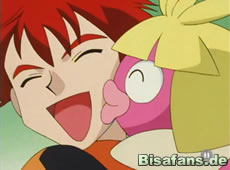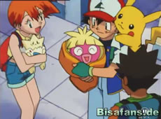 Bis dahin erfahren unsere Freunde, daß Kussilla mit ihren Küssen die Umwelt wahrnimmt... Kurz darauf erscheint die wilde Meute, die sich direkt auf Rocko stürzt. Als sie jedoch merken, daß Rocko nicht Brad ist, gehen sie wieder. Da entdecken Ash, Misty und Rocko eine Werbewand wo gerade der neueste Kinofilm dieses Brad präsentiert wird. Leider sind in der Zwischenzeit Kussilla, Togepi und Pikachu abgehauen, weil sie einem herumfliegenden Hoppspross-Roboter folgten der Team Rocket gehört. Zu allem Unglück gelingt es Jessie und James auch alle drei Pokémon zu fangen.