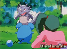 Pietra stürzt sich nach dem Kampf auf das Rizeros und hält es fest als dieses abtaucht. Nun folgen mehrere Tauchgänge bevor Rizeros wieder an Land kommt und letztlich den Kampf mit Pietra akzeptiert. Doch das Marill kann mit seiner Aquaknarre nur wenig ausrichten und droht vom Rizeros überwältigt zu werden. Auch ein Blubbstrahl wirkt nicht viel. Eine erneute Aquaknarre kann es jedoch genug schwächen, so daß Pietra das Rizeros mit ihrem Pokeball einsetzen kann. Leider gelingt das Fangen aber nicht und Marill setzt erneut die gesamte Angriffspalette ein. Als Abschlußangriff folgt diesmal aber ein Schlagschwanz, bevor Pietra es erneut mit einem Pokeball versucht. Und diesmal klappt es sogar, so daß das schwimmende Rizeros nun Pietra gehört!