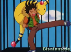Doch Janinia gibt so leicht nicht auf und befiehlt ihrem Onix sich am Strand festzubeißen und mit seinem Schwanz das Arbok zu schnappen. Auf diese Weise kann Onix den ganzen Ballon zu sich ziehen bis Janina an den Käfig herankommen kann und das Schloß mit einem Stein aufbricht. Als alle in Sicherheit sind, ist Pikachu mit seiner Donnerwelle an der Reihe, bevor Onix Team Rocket zu den Sternen schickt.