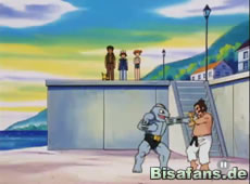 Als der Mann vom Maschock per Überroller weggeschleudert wird, eilt Ash ihm zu Hilfe, doch der Mann hat keine wirklichen Schmerzen. Er freut sich vielmehr über die perfekte Ausführung des Überrollers von seinem Maschock. Als sich herausstellt, daß Ash zur hiesigen Arena will, geht es im Dauermarsch zur Arena. Dabei wirkt der Mann irgendwie nicht so gut trainiert, da er kaum schneller als Ash, Misty und Rocko ist... Bei der Arena angekommen bekommt Ash von dem Mann, der sich nun als Hartwig vorstellt erst einmal ein ordentliches Essen.