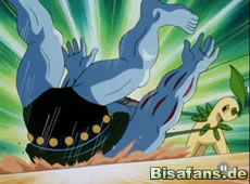 Nun muß Ash sein zweites Pokémon wählen, was ihm ziemlich schwer fällt. Ihm bleibt aber keine große Wahl, so daß er Lorblatt wählt. Quappo startet mit einer Aquaknarre, der Lorblatt ausweicht. Es kontert mit einem Rasierblatt und einem Rankenhieb, der Quappo voll trifft. Daraufhin startet Quappo einen Fokus, bekommt aber zuvor einen mächtigen Bodyslam von Lorblatt ab, der es K.O. schlägt.