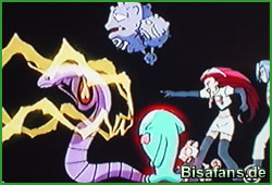 Gerade als das Schiff die Strudel passiert, taucht Team Rocket in Verkleidung auf und bietet unseren Freunden Getränke an. Natürlich nur mit dem Hintergedanken Pikachu in einem unbeobachteten Moment zu fangen. Dies geht jedoch (wie immer) schief und es kommt zu einem Kampf. Team Rocket setzt Smogmog und Arbok ein, während Ash sich auf den Donnerschock seines Pikachu verläßt. Dabei fallen alle über Bord und drohen in den Strudel zu geraten.