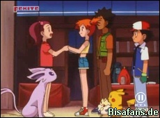 ...und siehe da – Jessie, James und Mauzi kommen auch schon bald vorbei und sehen ein wehrloses Psiana auf einer Wiese liegen. Natürlich nähern sie sich dem Psiana mit ihrem Heißluftballon und versuchen es zu fangen. Doch bei der Flucht wird Team Rocket von Rockos Iksbat verfolgt, so daß unsere Freunde ebenfalls folgen können.