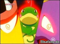 Unsere Freunde hören bei ihrer Suche von einem durchgedrehten Quappo und zwei merkwürdigen Trainern. Klar, daß dies Jessie und James sind. Als alle ankommen sehen sie Quappo, der von Jessie und James eine Art "Anzug" bekam, mit dem sie Quappo steuern können.