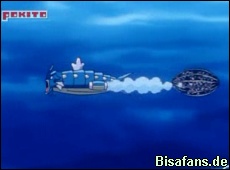 Ein Stück weiter können einige Lapras das Fangnetz durchbeißen und entkommen. Es kommt für Team Rocket jedoch noch schlimmer als das Team Rocket U-Boot in einen der Unterwasser-Strudel gerät.