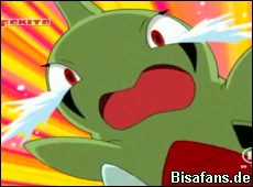 Da Ash nicht kämpfen will, ergreifen alle die Flucht. Auch das kleine Larvitar flieht.