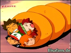 Erst eine ganze Weile später kann Larvitar seine Mutter überzeugen, daß Ash, Misty und Rocko seine Freunde sind. Ein Grund zur Freude. Doch die Freunde hält nicht lange, da Despotar plötzlich von einem Gangstertrio unter Führung eines gewissen Braggo in einem Roboter gefangen wird.