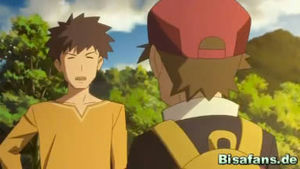 aufeinander. Blau fragt, ob Rots Pokémon denn stärker geworden ist,