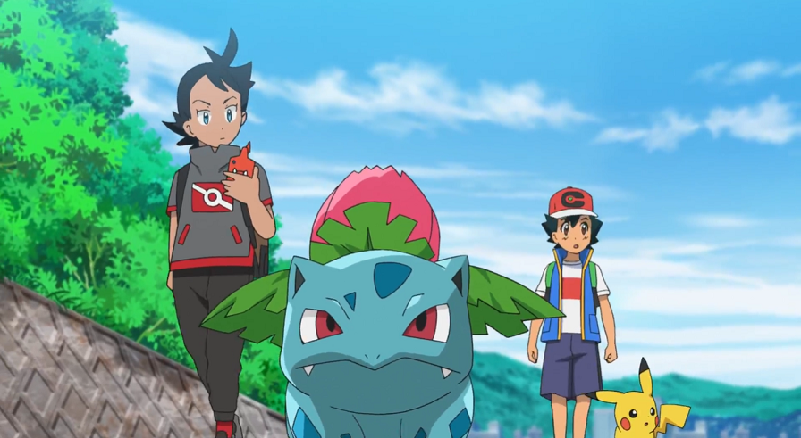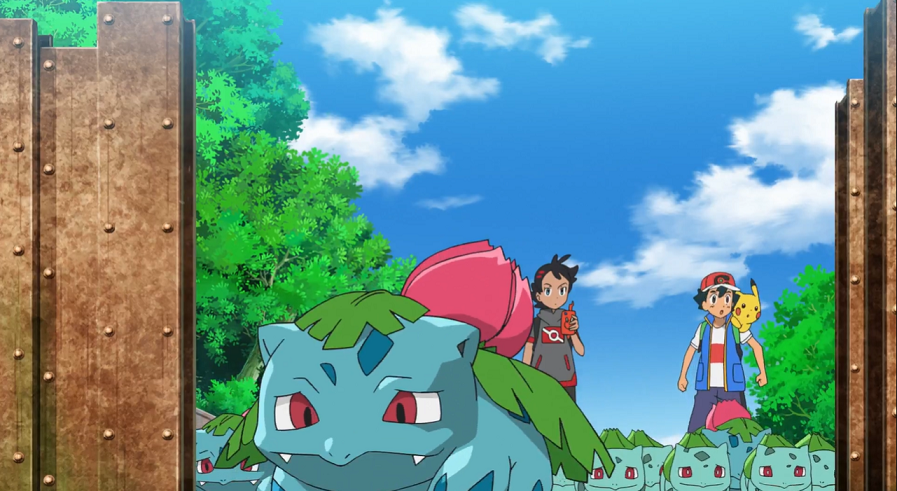 der Bisaknosp besser untersuchen zu können. Nachdem die beiden lange diskutiert haben, nutzt das Bisaknosp selbst seine Ranken und kann so das Hindernis überwinden. Ash und Goh folgen dem Pokémon, das nun beginnt, einen süßlichen Duft auszustoßen. Goh erklärt Ash, dass