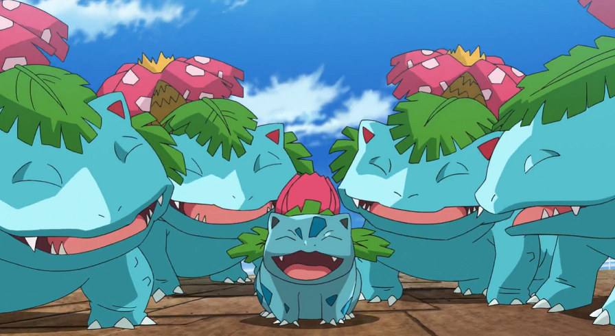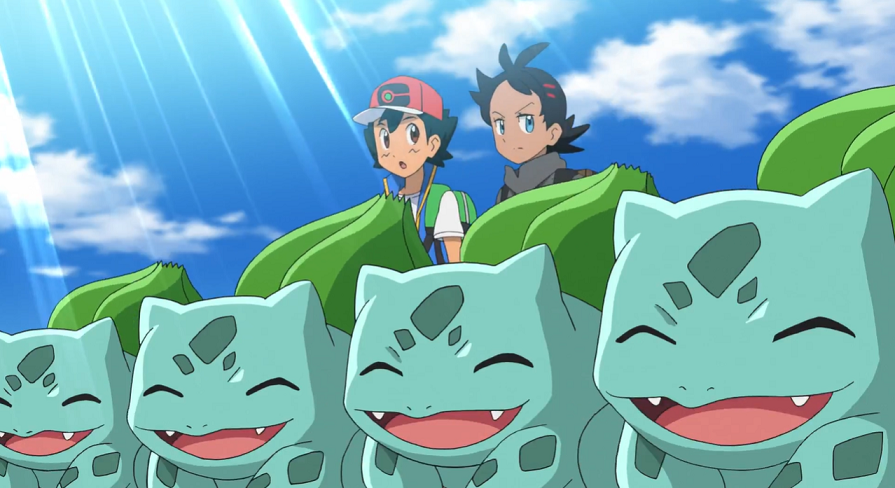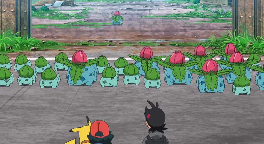 Die Bisaknosp beginnen nun, sich zu Bisaflor weiterzuentwickeln, was Ash und Goh mit großem Erstaunen beobachten. Mit Hilfe des Windes verteilen die Bisaflor besondere Pollen, die nicht nur zahlreiche Blumen in der Stadt zum Blühen bringen, sondern wodurch sich auch die Bisasam der Gruppe zu Bisaknosp weiterentwickeln können.