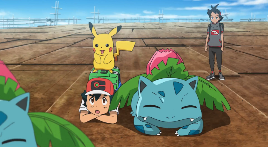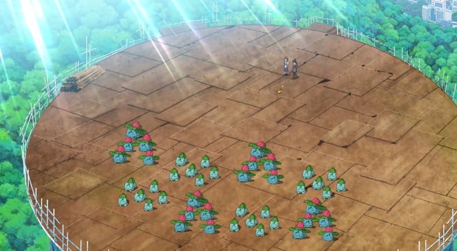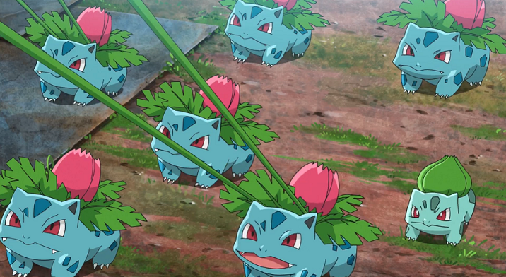 Um das Verhalten der Bisasam und Bisaknosp besser zu verstehen, schlägt Ash vor, sich wie diese zu benehmen. Als die Pokémon in der Sonne im angenehmen Wind liegen, beginnen einige von ihnen sich zu entwickeln, was jedoch abrupt gestoppt wird, als Team Rocket in