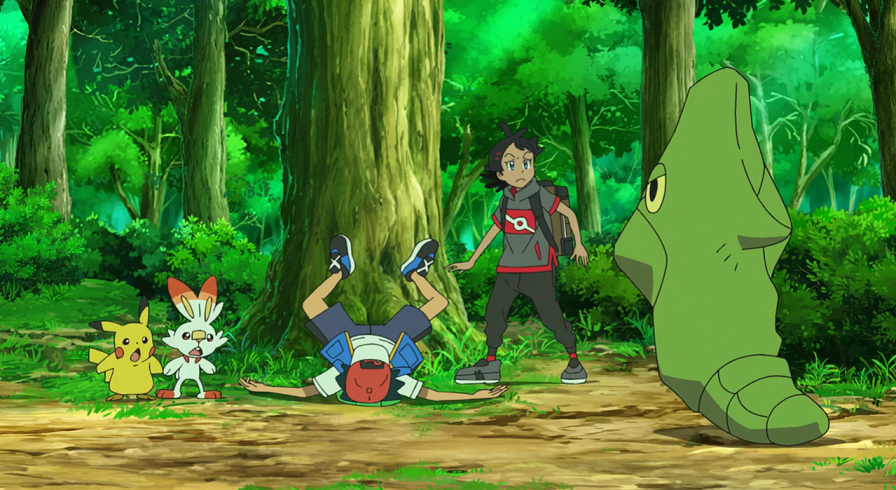 Nach längerer Suche bemerken Ash und Goh ein Rascheln auf in den Ästen eines Baumes. Mit einem kräftigen Tritt schaffen sie