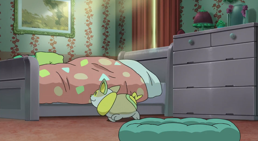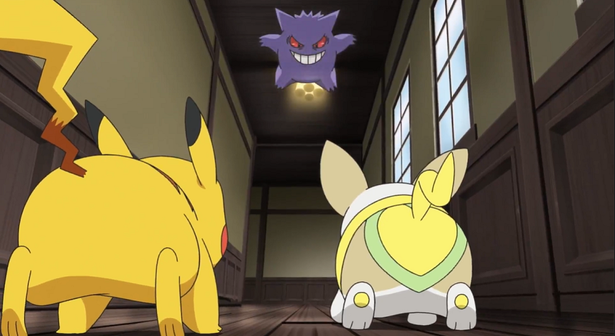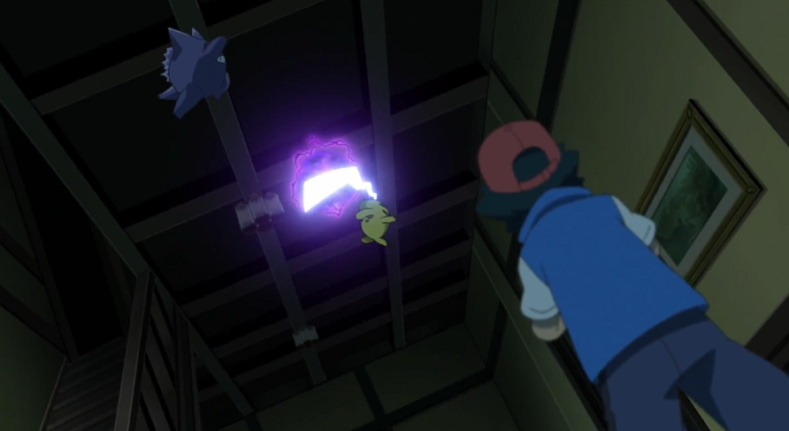 Dieser taucht einen Augenblick später im Flur auf, wo sich Ash, Goh, deren Pokémon Pikachu und Hopplo sowie Voldi aufhalten. Mit seinen Kräften versucht das Gengar, Chaos zu verursachen, doch Pikachu kann dessen Treiben mit einem mächtigen Donnerblitz stoppen, woraufhin das Gengar verschwindet.