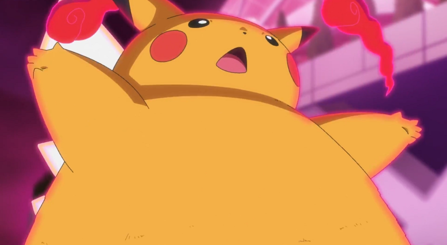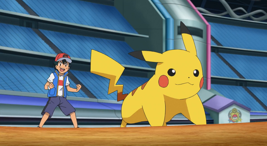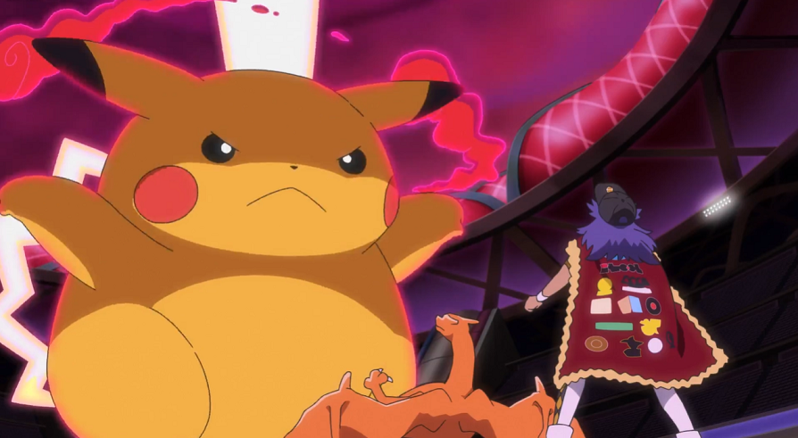 Vor dem Stadion angekommen, versuchen sie zuerst, das Gigadynamax-Pokémon mit Worten zu besänftigen, was aber nicht funktioniert. So entschließt sich Ash dazu, gemeinsam mit Pikachu sowie mit Goh und dessen Hopplo den Kampf aufzunehmen.