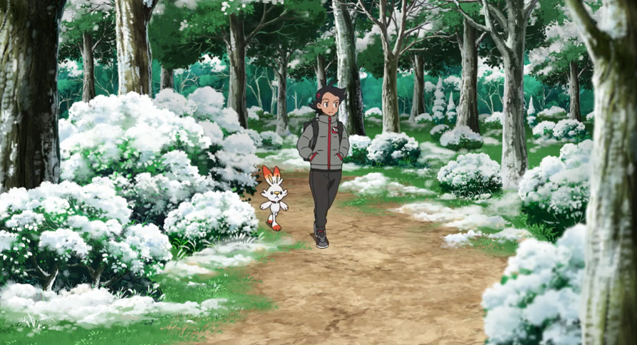 Gemeinsam mit Hopplo macht er sich durch die Kälte auf den Weg, wobei sie auch einen Park durchqueren müssen. In diesem bemerken sie drei Menki, die ein Tragosso umzingeln. Hopplo zögert nicht lange und greift, um dem Tragosso zu helfen, die Menki an. Bei einem Angriff Tragossos verliert dieses seinen Knochen, der in die Hände eines Menki fällt. Mit dem Knochen wollen die Kampf-Pokémon schnell die Flucht antreten. Tragosso, Hopplo und Goh folgen ihnen, können sie kurz stellen, doch den Menkis gelingt es dann doch, sich endgültig davonzumachen.