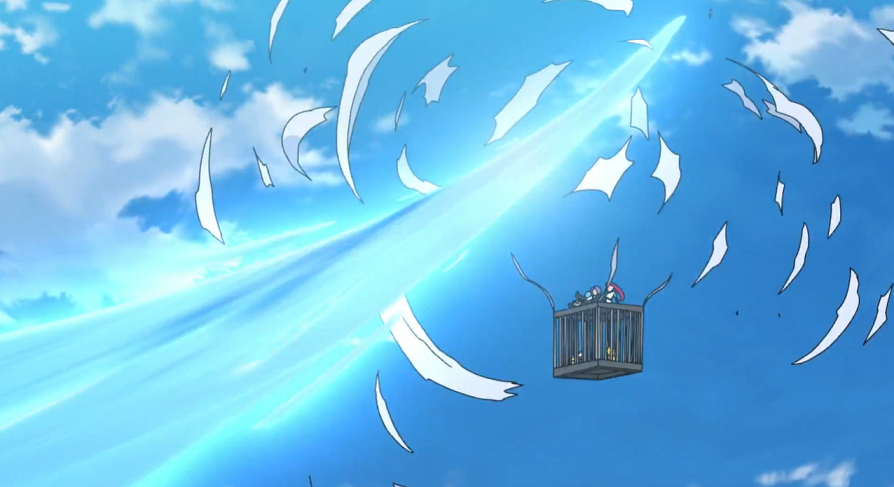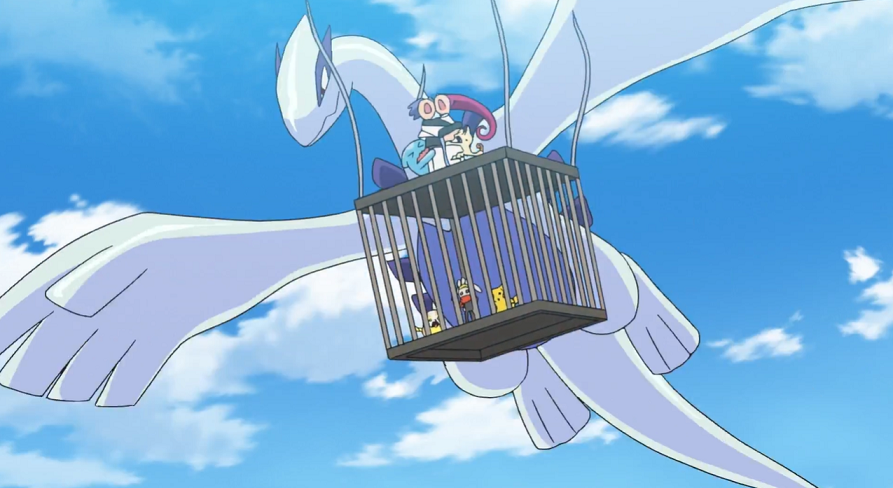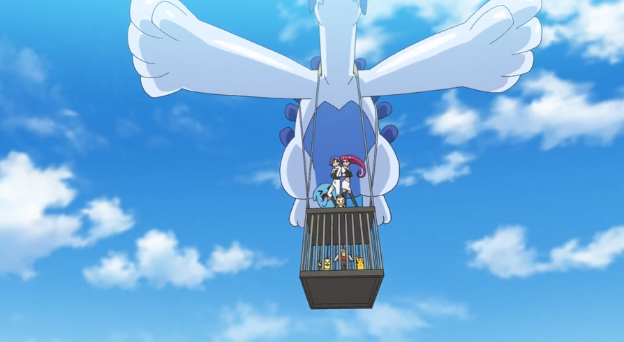 Aus der Ferne taucht nun plötzlich ein Luftstoß auf, der den Lugia-Ballon wie nichts davonfegt. Ein echtes Lugia kommt nun angeflogen und verhilft dem abstürzenden Käfig, auf dem Team Rocket sitzt, zu einer halbwegs sicheren Landung. Pikachu kann den Käfig mit Eisenschweif öffnen und sich sowie Kickerlo und Voldi befreien.