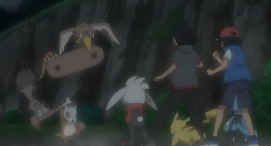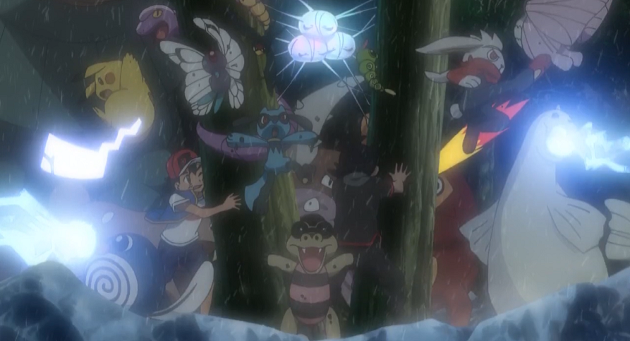 Allerdings will der Regen nicht aufhören, was die Entwicklung der Panekon in Gefahr bringt. Große Wassermassen aufgrund des starken Regens bedrohen nun die beiden Bäume, zwischen denen die Panekon hängen und auf ihre Entwicklung warten. Als diese umzuknicken drohen, eilen Golgantes, Ash, Goh und alle anderen Pokémon des Parkes zur Hilfe und schaffen es gemeinsam, die Bäume zu stabilisieren, die Wassermassen mit Eisattacken aufzuhalten und alle weiteren Widrigkeiten des Sturmes abwehren. So können sich die Panekon schließlich zu Pudox entwickeln, die sogleich zum Himmel fliegen und wieder für klares Wetter sorgen.