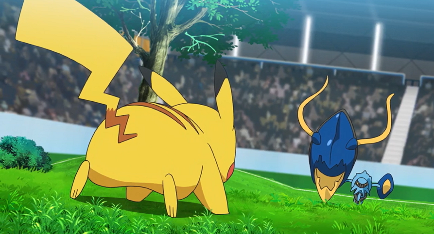 In ihrem ersten Kampf sind Ash und Pikachu gleich auf einem Gras-Kampffeld gegen ein Wummer gefordert. Dem flinken Pikachu gelingt es, unter der Beobachtung von Connie und ihrem Lucario, das Wummer mit seiner Eisenschweif-Attacke zu besiegen.