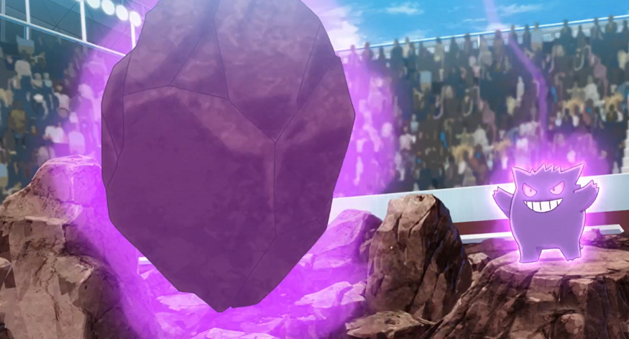 Mit einer schnellen Akrobatik-Attacke kann Wie-Shu auch sofort Gengar treffen. Dieses schüttelt sich und versucht, Wie-Shu mit Psychokinese zu schaden, in dem es mit einem Felsbrocken attackiert. Das Kampf-Pokémon kann Gengars Attacke jedoch abwehren und mit Kehrtwende Ashs Pokémon nochmals schaden, ehe es in seinen Pokéball zurückkehrt. Nun wird Lucario eingewechselt, das Gengar sogleich mit seiner Knochenhatz-Attacke ordentlich verprügelt und kampfunfähig macht.