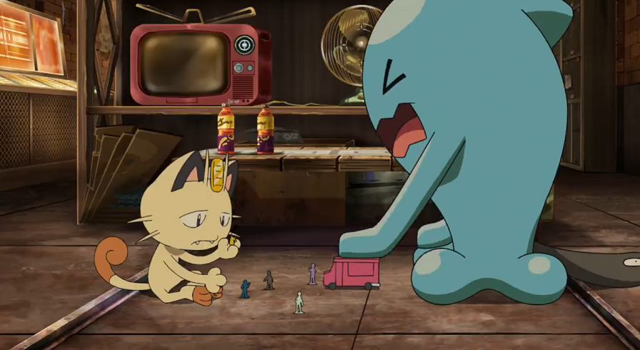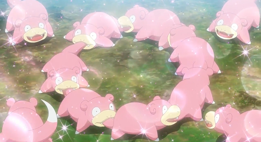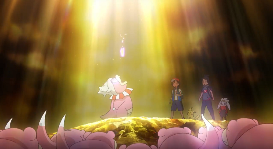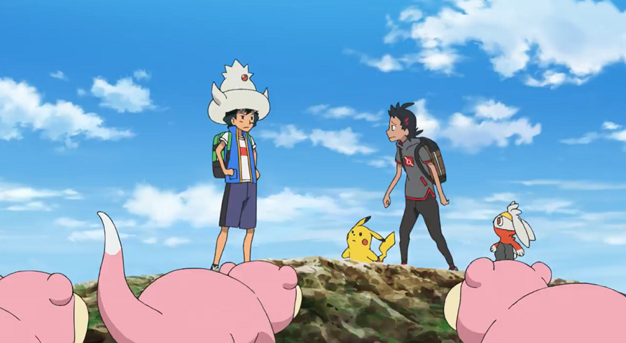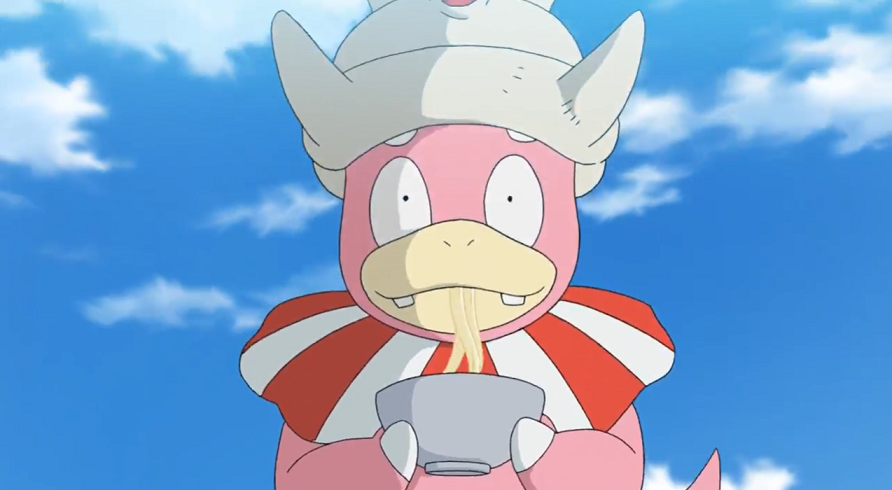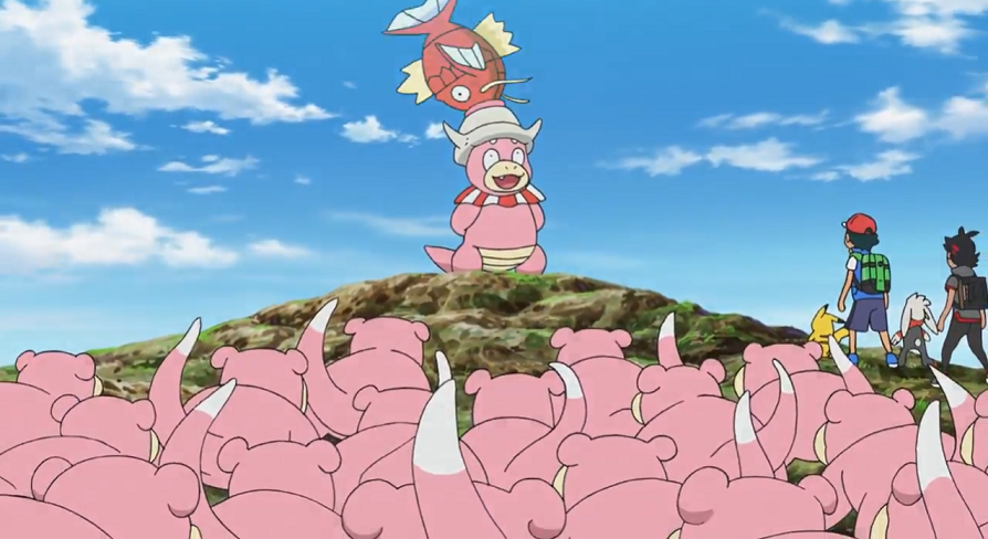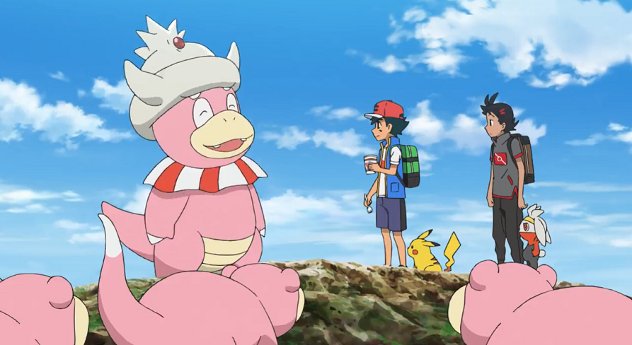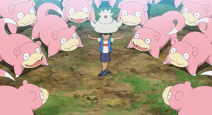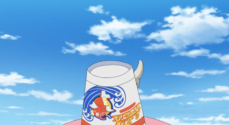 Ash und Goh sind mit ihren Pokémon auf der sogenannten Flegmon-Insel, auf der, wie der Name schon sagt, zahlreiche Flegmon leben, welche die beiden interessiert beobachten. Goh will die Gelegenheit nutzen und ein Flegmon fangen. Während Ash gemütlich eine Nudelsuppe schlürft, macht er sich daran, ein passendes Flegmon auszuwählen, als er auf einmal ein Laschoking bemerkt. Dieses kommt, ebenfalls eine Nudelsuppe schlürfend, auf die beiden zu. Anstelle eines Flegmons nimmt sich Goh vor, das Laschoking zu fangen, das jedoch mit Hilfe seiner Psychokinese Gohs Pokéball spielend abwehren kann. Das Laschoking zeigt sich nun interessiert an Ashs restlicher Nudelsuppe, die dieser ihm gerne überlässt. Mit seiner Psychokinese lässt es die Nudeln stilvoll in die Höhe steigen, um sie dann gekonnt in sein Maul fallen zu lassen. Im Tausch gegen seine Krone nimmt es sich dann mit Hilfe seiner Psycho-Kräfte Ashs leeren Nudelsuppenbecher. Laschokings Krone landet so stattdessen auf Ashs Kopf, was zu einer plötzlichen Verhaltensänderung bei diesem führt. Dieser bezeichnet sich nun als Flegmon-Meister. Goh, Kickerlo und Pikachu versuchen erfolglos, Ash die die Krone wieder abzunehmen, da er allen ihren Versuchen ungewöhnlich flink ausweichen kann. Gemeinsam mit Goh will Ash nun die Flegmon in eine positive Zukunft führen, weshalb er seinem Freund anbietet, mit Hilfe eines Muschas zu einem Lahmus zu werden. In einem überraschenden Moment gelingt es Kickerlo, Ash die Krone vom Kopf zu kicken, sodass dieser umgehend wieder normal wird. So landet die Krone allerdings auf Gohs Kopf und nach einem weiteren Kick Kickerlos auf Pikachu. Dieses entledigt sich der Krone mit Hilfe seines Donnerblitzes, von dort landet sie bei Kickerlo. In der Folge wandert die Krone nochmals zahlreich hin und her, amüsiert beobachtet von den Flegmon sowie dem Laschoking, welches nun den Nudelsuppenbecher auf dem Kopf trägt. Unterbrochen wird die Szene erst, als plötzlich Gohs Karpador aus dem Weltall auf die Erde schießt und auf der Flegmon-Insel landet. Aufgrund des Aufpralls kommt es zu einem Rücktausch des Nudelsuppenbechers, der nun auf Ashs Kopf gelandet ist, sowie Laschokings Krone, die dieses nun wieder auf hat und auf der nun Gohs Karpador steckt. Goh freut sich sehr über die Rückkehr seines Pokémon.