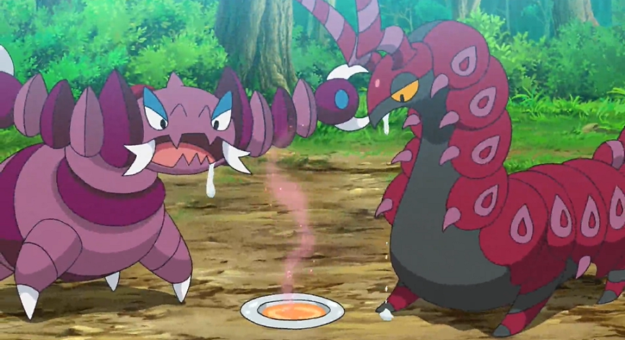 Plötzlich werden sie auf Schreie aus einem anderen Teil des Waldes aufmerksam, woraufhin sie schnell zu deren Ursprungsort eilen. Dort treffen sie auf Team Rocket, das gerade über einen weiteren Teller herfällt. Erstaunt, Ash und Goh im Wald zu begegnen, und durch das Essen wieder zu Kräften gekommen, fordert Team Rocket die Gruppe heraus und will sich deren Pokémon schnappen. Dabei rufen sie wie üblich ihre Spezialmaschine zu Hilfe, die ihnen von einem Pelipper gebracht wird. Aus dieser erhalten sie zwei Pokébälle mit starken Pokémon: Cerapendra und Piondragi, die sie in den Kampf schicken. Da die beiden Pokémon allerdings erstmals selbst durch eine noch offen herumstehende Portion angelockt und somit abgelenkt werden, versucht es Mauzi mit der Brechstange: Mit einem Fangnetz kann es Ash, Zirpeisa-Kyla, Pikachu, Memmeon und Kickerlo einfangen. Goh, der wie sein Pinsir und Zirpeisa-Kylas Skaraborn gerade noch dem Netz hat entkommen können, muss sich nun Team Rocket stellen. Da Gohs schüchternes Pinsir sich aber nicht traut, gegen Team Rocket anzutreten, bietet Zirpeisa-Kylas Skaraborn an, gemeinsam mit ihm zu kämpfen. Diesem gelingt es spielerisch leicht, Gohs Pinsir zu verteidigen und Team Rocket anschließend mit einer kräftigen Vielender-Attacke in die Flucht zu schlagen. Gohs Pinsir ist beeindruckt von Skaraborns Auftritt und scheint sich dadurch in dieses verliebt zu haben.