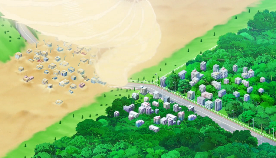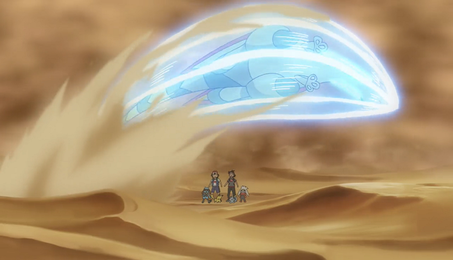 Derweil werden einige Bewohner in Malvenfroh City in der Hoenn-Region Zeuge eines gewaltigen Sandsturmes. Aus diesem vernehmen sie ein angenehmes, singendes Geräusch, weshalb sie sich, wie hypnotisiert, direkt in den Sandsturm begeben.