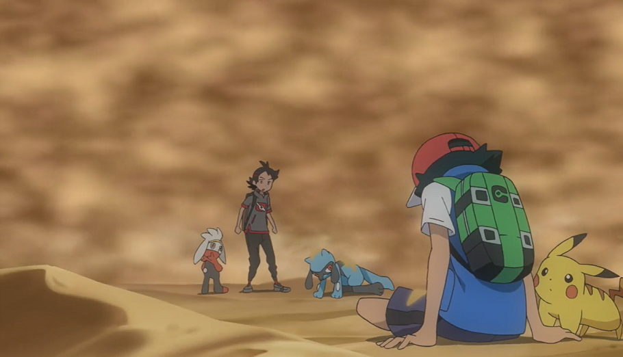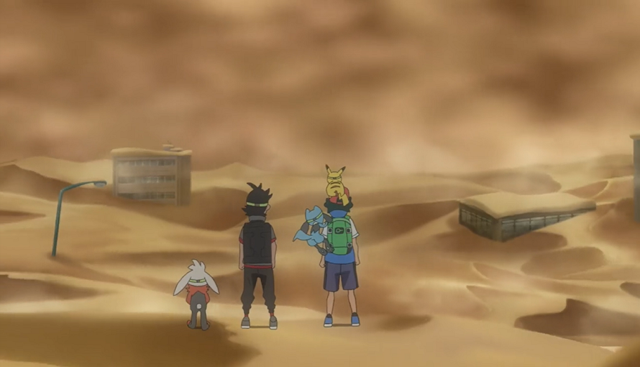 In Malvenfroh City angekommen, können Ash und Goh begutachten, wie bereits große Teile der Stadt im Sand begraben sind. Als die beiden das angenehme, singende Geräusch hören, ist Ash, der bisher wenig Motivation für die Untersuchung hat aufbringen können, auf einmal wie ausgewechselt. Um die Ursache des Geräusches zu finden, beschließen die beiden, zusammen mit ihren Pokémon und ausgerüstet mit Schutzbrillen, ebenfalls in den Sandsturm zu gehen.