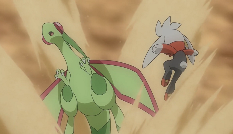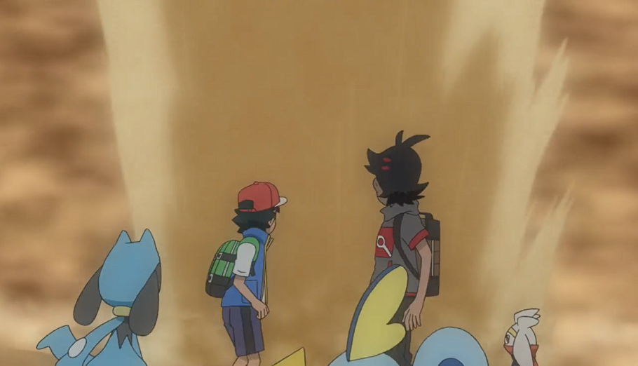 Da die beiden nun mit Knacklion und Vibrava bereits zwei Pokémon einer Entwicklungsreihe gefunden haben, rechnen sie nun auch noch mit Libelldra, das sich tatsächlich einen Moment später aus dem Sand erhebt. Goh macht Libelldra als Ursache für den Sandsturm sowie das Geräusch aus, das es durch das Zusammenspiel des Sandes mit seinen Flügeln erzeuge. Vermutlich habe es den Sandsturm ausgelöst, um an diesem Ort sein Nest zu bauen. Da sich Libelldra nicht so einfach fangen lässt, will Goh gegen es kämpfen und bittet dazu Ash, der kurz zögert, um Unterstützung. Dieser schickt Pikachu in den Kampf. Immer noch verunsichert, lässt Ash sein Pikachu mit Donnerblitz angreifen, um dann festzustellen, dass diese Attacke gegen das Boden-Pokémon keine Wirkung zeigt. Deshalb soll es Riolu richten, doch dessen Vakuumwellen kommen nicht durch die von Libelldra zu dessen Schutz errichteten Sandwirbel. Gohs Memmeon, das hartnäckig Aquaknarren abfeuert und dadurch den umherwirbelnden Sand immer weiter durchnässt, hat nach einigen Versuchen mehr Erfolg und kann Libelldra treffen. Als so Libelldras Schutz gefallen ist, feuern Riolu und Memmeon in der Folge zahlreiche Vakuumwellen und Aquaknarren auf ihren Gegner, was diesen dazu zwingt, im Sand abzutauchen. Libelldra bereitet nun seinen Drachenstoß vor; dazu taucht es immer wieder aus dem Sand auf und ab und nimmt dadurch ordentlich Fahrt auf. So räumt es zuerst Memmeon ab, indem es dieses aus dem Sand auftauchend mit seinem Kopf wegstößt, und droht nun, Riolu zu attackieren, dessen Vakuumwellen das im Sand versteckte Pokémon nicht treffen können. Ash ist aufgrund seiner Niederlagen immer noch sehr verunsichert und traut sich nicht, Riolu Angriffe aus der Nähe wagen zu lassen. Da er zu lange überlegt, kann Libelldra auch Riolu treffen.