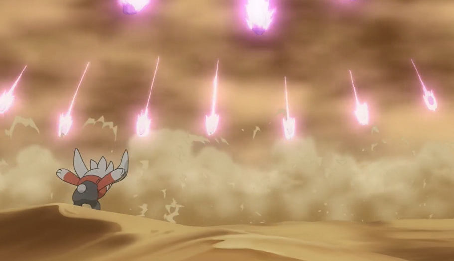 Nachdem sie sich durch den Sturm gekämpft haben, erreichen sie nach einiger Zeit dessen ruhigeres Inneres. Dort finden sie sich in einer gewaltigen Sandwüste wieder, die die Stadt unter sich begraben hat. Als sie aus der Ferne plötzlich Hilfeschreie vernehmen, eilen die beiden los und stehen plötzlich vor der Fallgrube eines Knacklions, in die drei Personen langsam hineinrutschen. Goh sieht nur eine Lösung, um die drei zu retten: Er will das Knacklion fangen. Kann dieses seinen ersten Wurf noch erfolgreich mit einem Sandspritzer abwehren, gelingt es Goh im zweiten Versuch mit einem Curveball-Wurf, das Boden-Pokémon zu fangen. So können die Geretteten froh und dankbar über die rechtzeitige Hilfe wieder den Rückweg aus dem Sandsturm antreten, während Ash und Goh sich weiter auf die Suche nach der Quelle des Geräusches machen. Dabei treffen sie auf ein Vibrava, das ihnen mit seinen Ultraschallwellen gewaltige Kopfschmerzen bereitet. Goh kann dieses Pokémon mit Hilfe eines Curveballs und im Zusammenspiel mit seinem Kickerlo, das den Pokéball volley auf Vibrava kickt, ebenfalls im zweiten Versuch fangen.