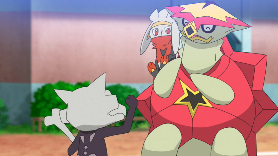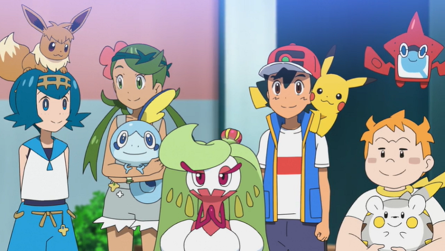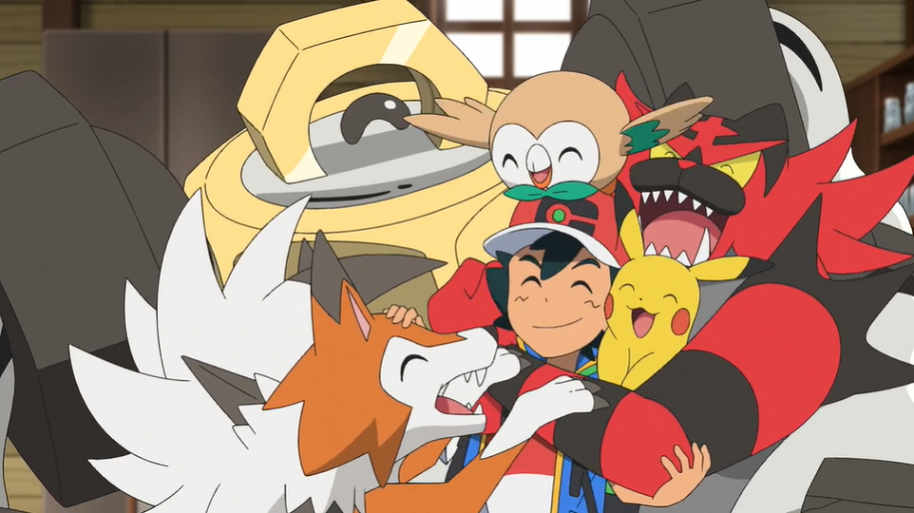 Im Haus trifft Ash auf seine Pokémon aus der Alola-Region, um die sich nun Kukui und Burnett kümmern: Bauz, Fuegro, Melmetal und Wolwerock (Zwielichtform), die sich vor lauter Freude zuerst auf ihn und anschließend auf Goh stürzen.