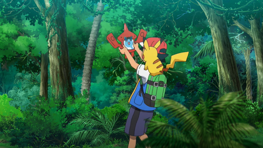 Ash ist derweil im Wald auf der Suche nach Goh, als er auf den Rotom-Dex trifft. Auch dieser ist sehr froh, Ash wieder zu sehen und berichtet, dass Goh bereits mit allen anderen in der Pokémon-Schule sei und man dort auf Ash warte.