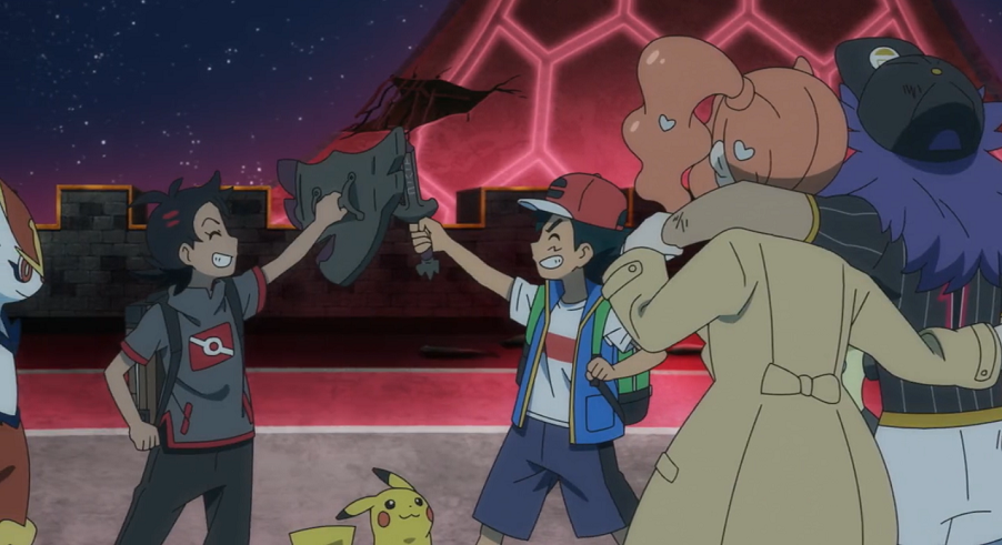 Goh nimmt nun einen seiner Pokébälle, um Endynalos zu fangen. Da der Ball auf einmal sehr groß wird, hilft ihm Ash, diesen auf Endynalos zu werfen. Tatsächlich bleibt das Pokémon diesmal im Ball. Ash und Goh sind voller Freude darüber. Zacian und Zamazenta verschwinden wieder, lassen Ash und Goh jedoch das rostige Schwert und den rostigen Schild zurück. Durch den Sieg über Endynalos nehmen auch sämtliche dynamaximierten Pokémon in der Galar-Region wieder ihre normale Form an. Delion bedankt sich bei Ash und Goh, die jedoch auf die Helden von Galar, Zacian und Zamazenta verweisen.