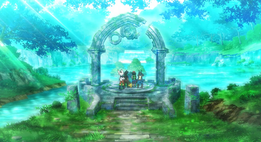 Ash erreicht die Turmspitze, wo sich Delion und Glurak weiter einen schweren Kampf mit Endynalos liefern. Kurz darauf stößt auch Goh hinzu. Beide trauen ihren Augen nicht, als sie Lucario bzw. Liberlo sehen und freuen sich über die Entwicklung der Pokémon.