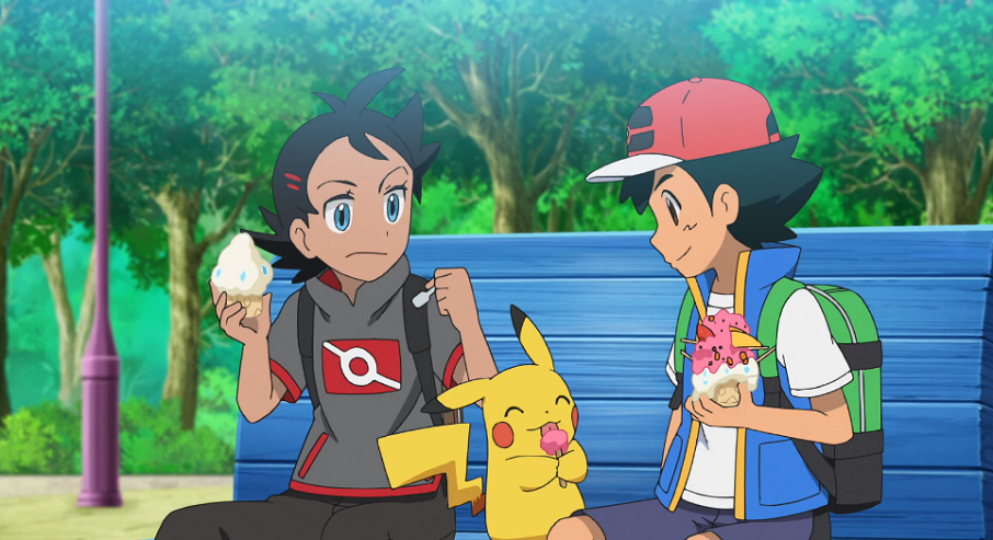 Ash und Goh suchen sich einen ruhigen Platz auf einer Parkbank, wo sie gemeinsam mit Pikachu das Eis verspeisen wollen. Unterdessen kommt es zu einem kleinen Streit zwischen Gohs Kickerlo und Ashs Lucario, da letzteres mit Kickerlos umgänglicher Art nicht klarzukommen scheint.