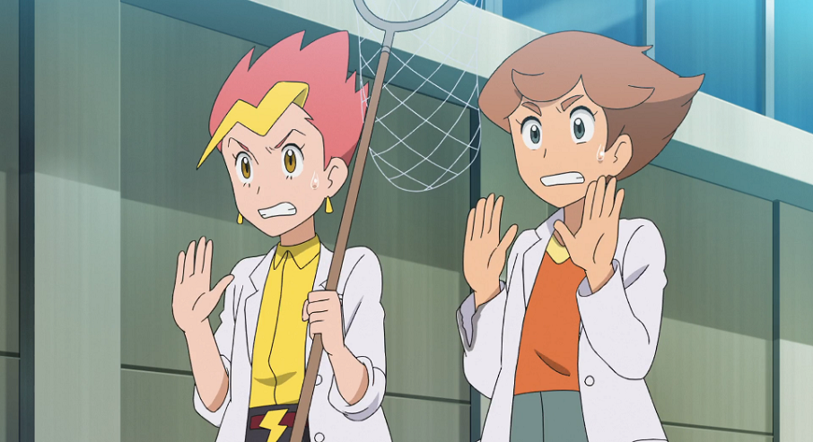 Von der anderen Seite stürmen nun Goh und Chloe, gemeinsam mit Evoli und Voldi und verfolgt von den beiden Forschern, herbei. Da Team Rocket den Weg versperrt, können die beiden nicht weiter und müssen sich den Forschern stellen. Diese erklären, dass sie nichts Böses im Sinne hätten. Sie seien Forscher eines Labors, das Evoli und dessen Entwicklungen untersuche und Evoli sei ihnen ausgebüchst.
