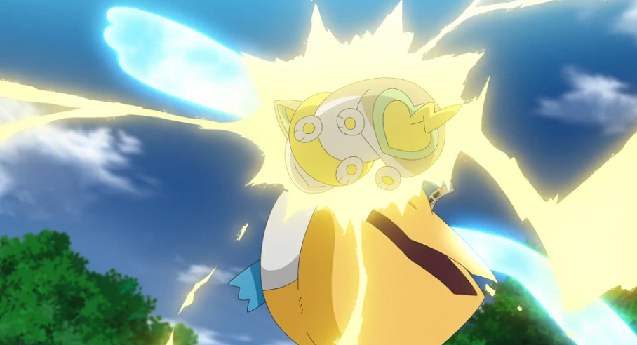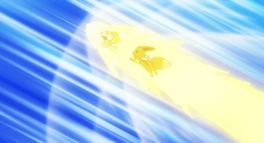 Ash, der immer noch mit Pikachu in der Fallgrube festsitzt, erkennt Gohs Stimme und weist seinen Freunde auf die gestohlenen Pokémon und Team Rocket hin. Team Rocket ruft wie immer seine Spezialmaschine herbei, die von einem Pelipper gebracht wird. Allerdings wirft die Maschine dieses Mal keine Pokébälle aus, sodass Team Rocket Pelipper zurückruft, um sich zu beschweren. Das Wasservogel-Pokémon kommt tatsächlich zurück und lässt sich von Team Rocket stattdessen in den Kampf gegen Voldi schicken. Evoli, das Voldis Kampf verfolgt, ist beeindruckt und möchte es unterstützen. Dazu imitiert es Voldi und auf Chloes Anweisung setzen beide Pokémon gemeinsam Funkensprung ein, womit sie Pelipper davonstoßen. Chloe ist voll des Lobes für ihre beiden Pokémon und auch die Forscher sind beeindruckt von Evolis Kräften.