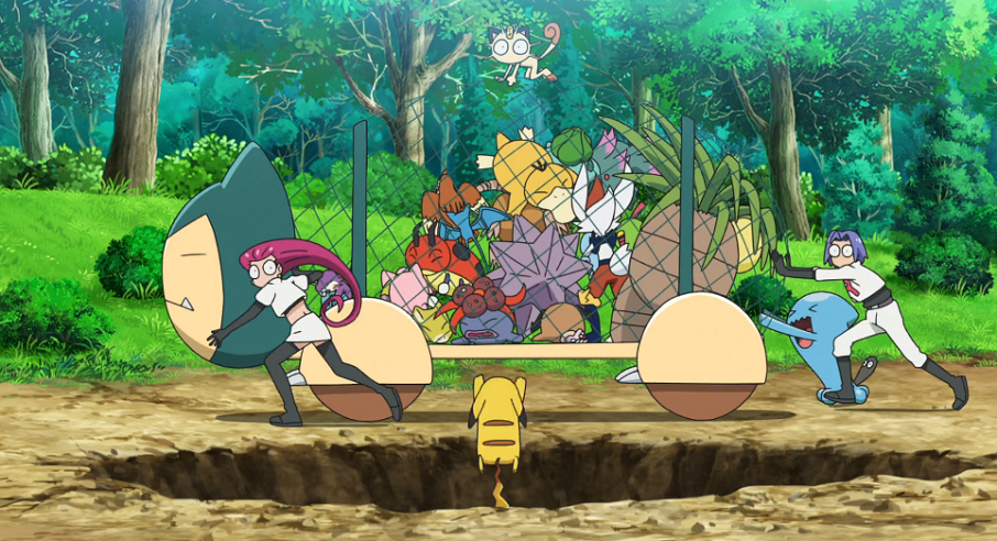 Gerade als Team Rocket den Freudentaumel ausnutzen und sich mit den gestohlenen Pokémon davonmachen will, können Ash und Pikachu aus der Grube klettern. Mit Eisenschweif gelingt es Pikachu, die Pokémon aus dem Fangnetz zu befreien, ehe es Team Rocket mit einem kräftigen Donnerblitz in die Flucht schlägt.
