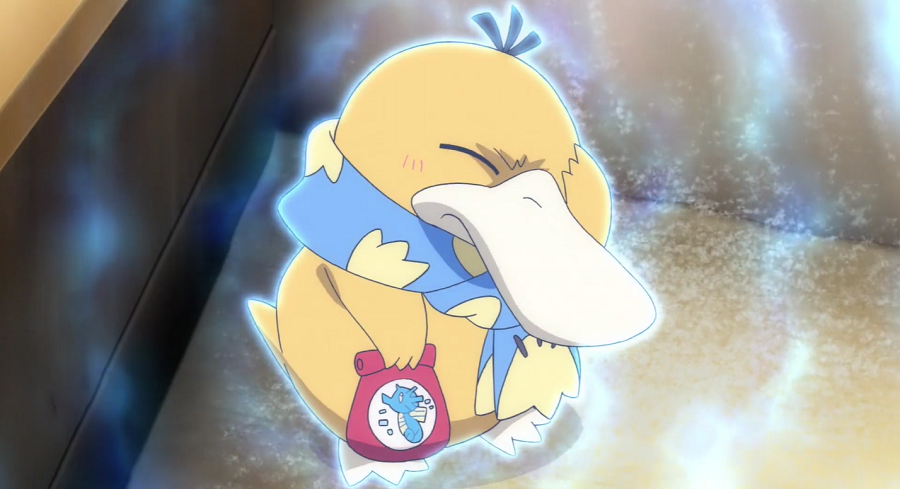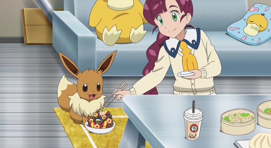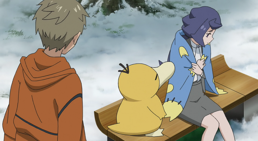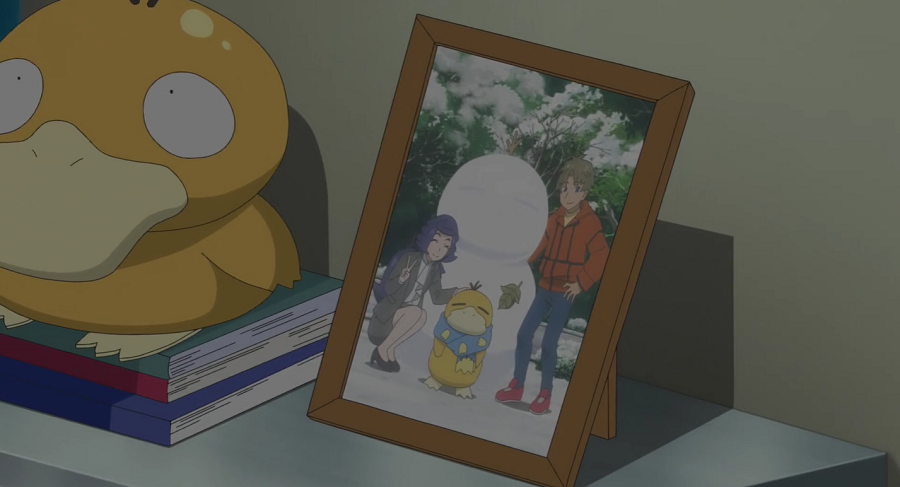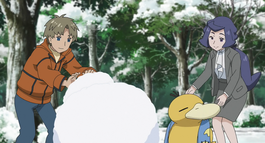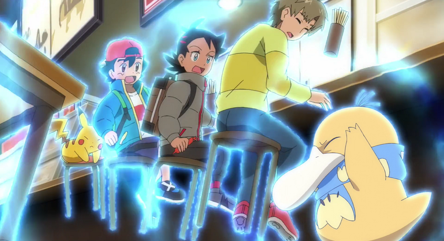 Ash, Goh und Pikachu haben mittlerweile ein Restaurant aufgesucht, wo sie sich aufwärmen und wieder zu Kräften kommen können. Da ihnen das Essen so gut schmeckt, kommen sie mit einem jungen Mann, der am Tresen neben ihnen sitzt, ins Gespräch. Er schwärmt ebenfalls von dem Essen. Dabei bemerken sie das Enton des Mannes, das geschlossene Augen hat, einen blauen Schal trägt, der ihnen sofort auffällt, und das erkältet zu sein scheint. Der Mann erklärt, dass das Enton keine Kälte möge und es deshalb stets seinen blauen Lieblingsschal trage. Da das Enton plötzlich starke Kopfschmerzen zu haben scheint, beginnt es seine Psychokräfte einzusetzen, wodurch es nicht nur Ash, Goh, Pikach und den Mann, sondern auch sämtliches Inventar zum Schweben bringt. Der Mann streckt seinen Arm aus und beginnt, Enton am Kopf zu tätscheln, wodurch dieses sich beruhigt und die Kopfschmerzen sowie entsprechend auch die eingesetzten Psycho-Kräfte nachlassen. Dem Mann tut der kurze Schreckmoment sehr leid, weshalb er die beiden zu einem Ramen einlädt.