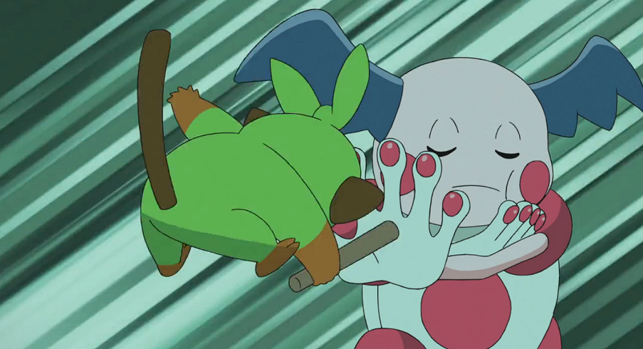 Doch auch Team Rocket ist nicht weit und stellt sich Ash und Goh in den Weg. Jessie will Chimpep in seinen Pokéball zurückrufen, verfehlt aber das geschickt ausweichende Pflanzen-Pokémon. Mit einem Tackle schafft es Pikachu, Jessie den Ball aus der Hand zu schlagen. Chimpep nutzt die Gelegenheit und zerstört den Ball mit seinem Schlägel. Aus Versehen übersetzt Mauzi daraufhin, wie Chimpep erklärt, es wünsche sich, dass Goh es fange. Der erfreute Goh zögert nicht lange und wirft, wie auch Jessie, einen neuen Pokéball auf Chimpep. Nachdem das Schimpansen-Pokémon Jessies Pokéball auf sie zurückgeschleudert hat, lässt es sich von Gohs Pokéball fangen. Pikachu macht anschließend mit einem gewaltigen Donnerblitz sämtliche Ambitionen Team Rockets zunichte und schlägt es in die Flucht.