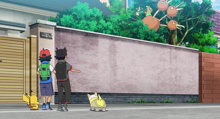 Die von Voldi aufgenommene Fährte führt sie hinauf aufs Dach des Instituts, wo eine Tür offen gestanden hat. Von dort ausgehend kann Voldi die Spur bis in die Stadt hinein weiterverfolgen. Ash und Goh, mit Chimpep im Arm, laufen dem Elektro-Pokémon dabei interessiert hinterher bis dieses vor einem Grundstück halt macht. Da Chimpep sofort über die Mauer des Grundstücks springt, nehmen Ash und Goh an, ihr Ziel gefunden zu haben. Daher klingeln sie, um mit Chimpeps Trainer in Kontakt zu treten, als Chimpep auf einmal auf einem Dodri über die Mauer zurück auf die Straße springt.