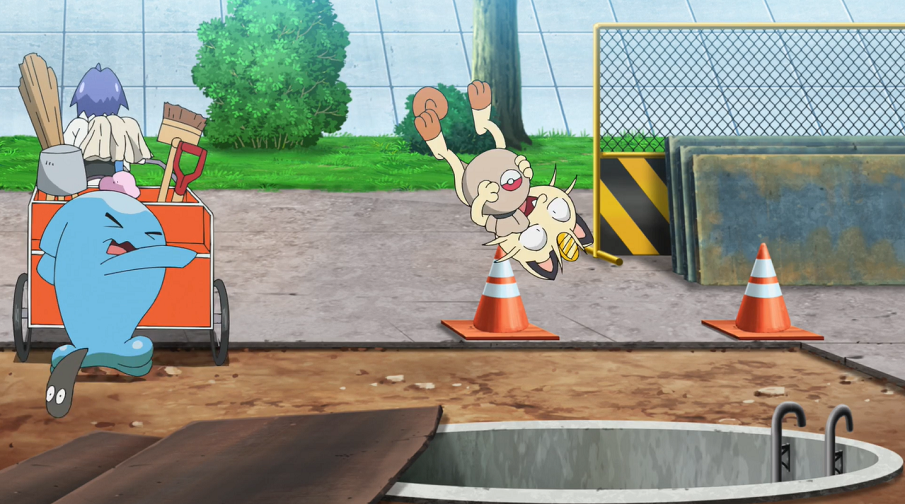 Es dauert nicht lange, bis sie das verkleidete Team Rocket mit einem Handwagen an einer Straße entlang gehen sehen. Als sie diese fragen, ob sie etwas mit dem Verschwinden der Tauros zu tun haben, gibt sich Team Rocket zu erkennen. Da sie jedoch nicht daran denken, die Tauros zurückzugeben, treten sie die Flucht an. Hastig laufen sie dabei durch eine Baustelle davon, wobei der Wagen kurz an einem Brett einer Grabenbrücke hängen bleibt. Mauzi, das auf dem Wagen sitzt und den Beutel mit den Pokébällen der Tauros in der Hand hält, fällt dadurch vom Wagen und direkt in einen Schacht. Zwar landet Mauzi weich auf einem Sack, allerdings kann es den Beutel nicht länger halten, wodurch einige Pokébälle herausfliegen und Tauros aus diesen entkommen, die schließlich auf Mauzi landen.