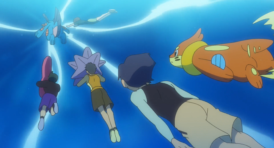 Gemeinsam machen sich alle mit ihren Pokémon ans Training und beginnen, mit ihren Pokémon umherzuschwimmen. Ash muss dabei feststellen, dass sein Pescragon aufgrund seines Körpers kein wirklich schneller Schwimmer ist. Als Ash seinem Pokémon helfen und es anschieben will, geht es unter. Dabei stellen sie jedoch fest, dass es seine Schnelligkeit zu Fuß auf dem Meeresboden einsetzen kann.